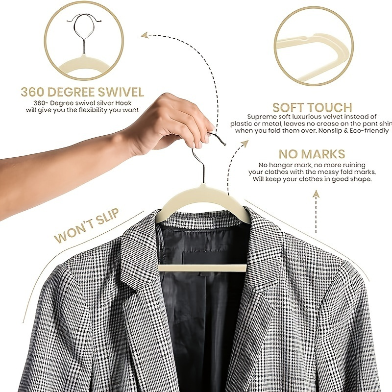 1. Soft & Anti-Slip: High-density velvet with anti-slip coating keeps clothes from slipping; no harsh friction or cold touch.