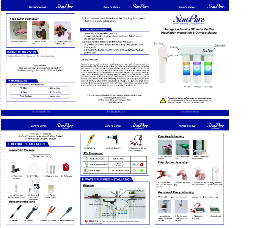 | BREAKTHROUGH! SimPure undersink water filter systems have been designed to fit discretely connect under kitchen counter or sinks. Its triple filteration also gives you the heavy duty power to easily provide you with fresh clean drinking water right out of the tap. Don't ruin the ambiance of your kitchen counter or cabinet , it also works with all faucets unlike most countertop models. |