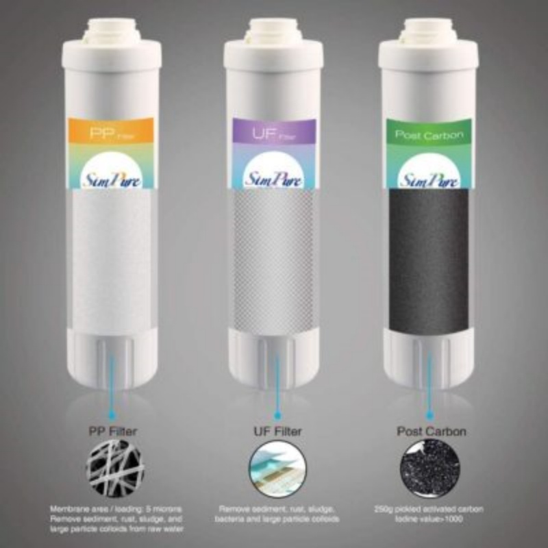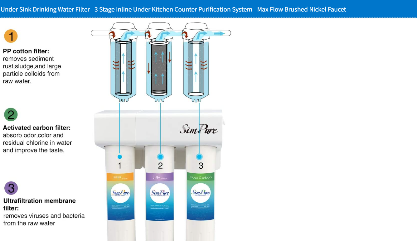 | UNMATCHED PERFORMANCE! The SimPure under sink water purifier reduces contaminants commonly found in tap water like chlorine, sediment, and radon; ensuring that you and your family get healthy and delicious drinking water always. Three in line filters are the perfect way to ensure maximum high filtration. |