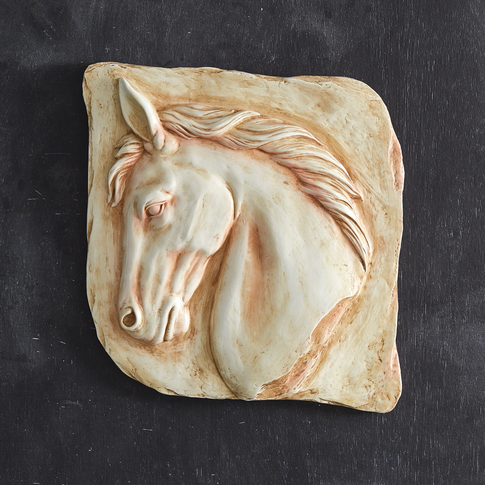 Crafted with meticulous attention to detail, this stunning masterpiece captures the power and grace of majestic equines within the grandeur of a classical Colosseum setting. The resin material lends a lifelike quality to an intricately carved stone horse. To hang, use its two keyhole hangers.