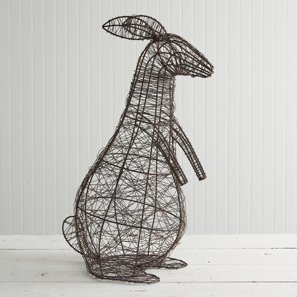 This wire bunny stands just under 2 feet tall! It is crafted out of hand wrapped wire on a metal frame.