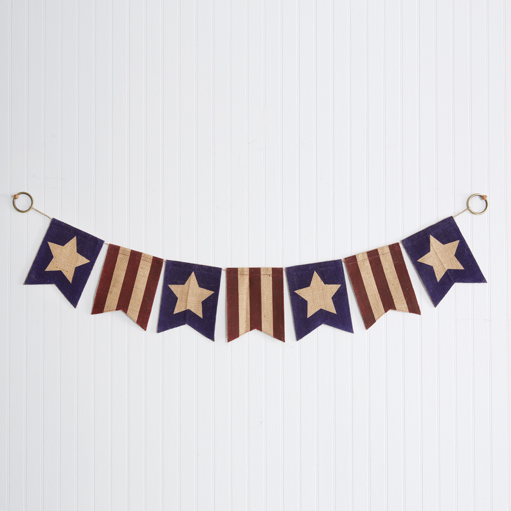 American the Beautiful! Celebrate its big day or patriotism all year long with our banner. Crafted of burlap, this banner will accentuate existing farmhouse or primitive decor. To hang, use nails with its two brass hoops.