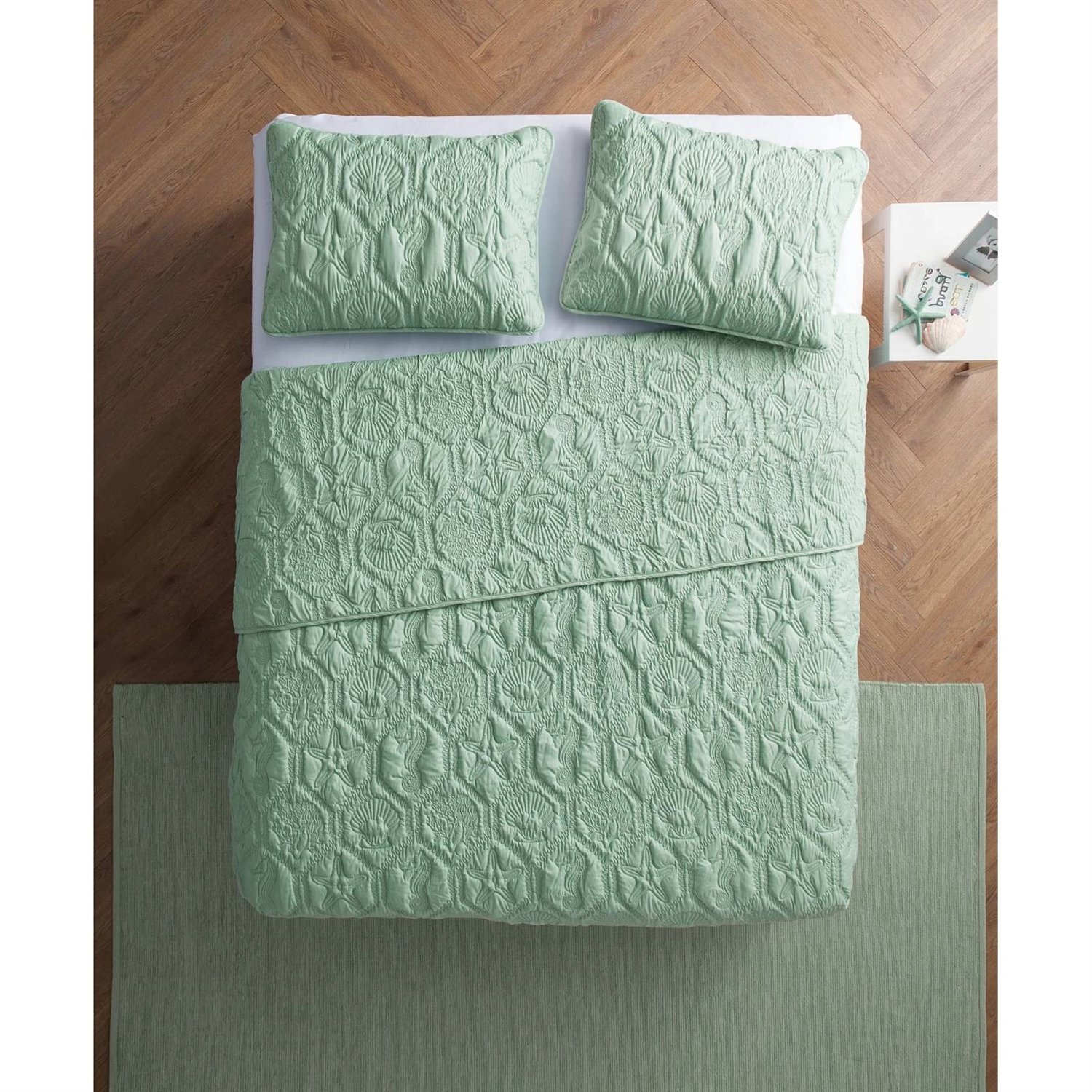 King Coastal Beach Starfish Seashell Seahorse Light Green Teal Quilt Set
