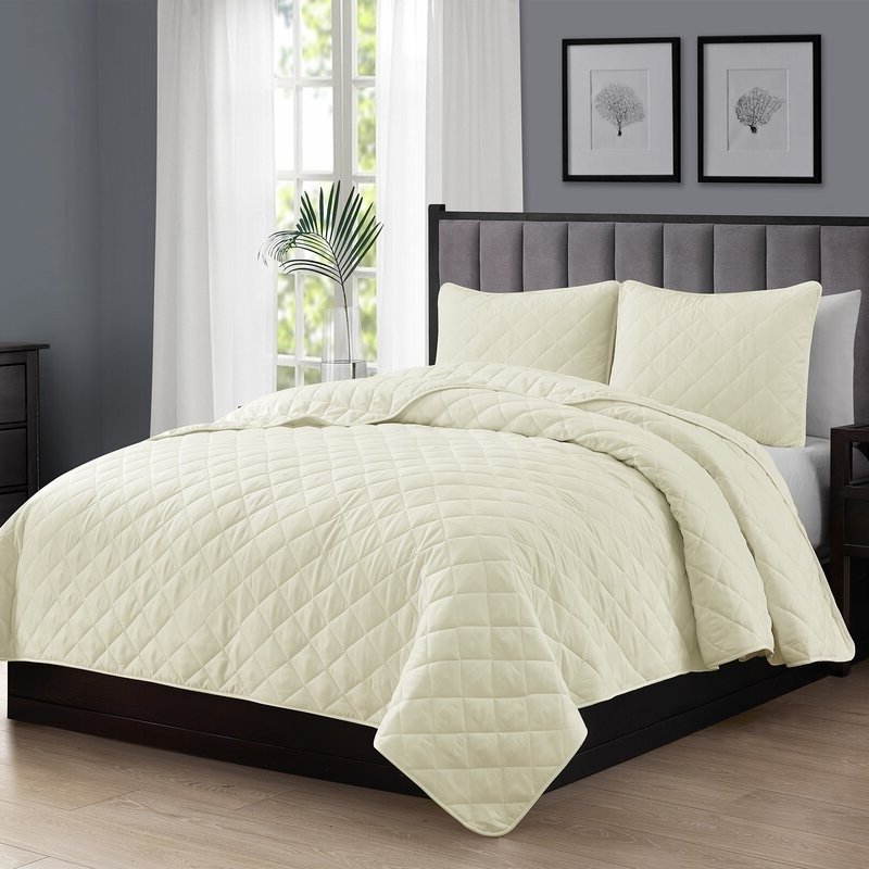 Full Queen 3-Piece Ivory Polyester Microfiber Reversible Diamond Quilt Set